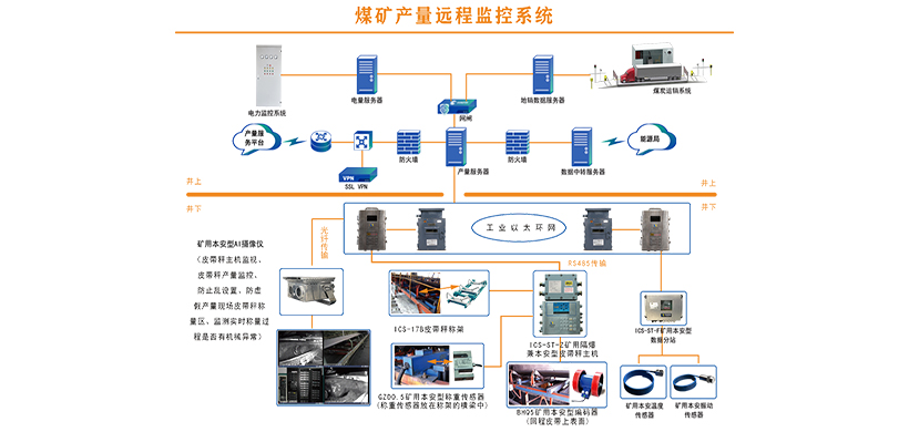 系統(tǒng)主要由礦用隔爆兼本安型皮帶秤主機(jī)、礦用稱重傳感器、礦用速度傳感器、礦用本安型攝像機(jī)、礦用本安型數(shù)據(jù)分站、礦用本安溫度傳感器、礦用本安振動(dòng)傳感器、礦用防爆交換機(jī)以及《煤礦產(chǎn)量遠(yuǎn)程監(jiān)控系統(tǒng)》軟件系統(tǒng)等組成。