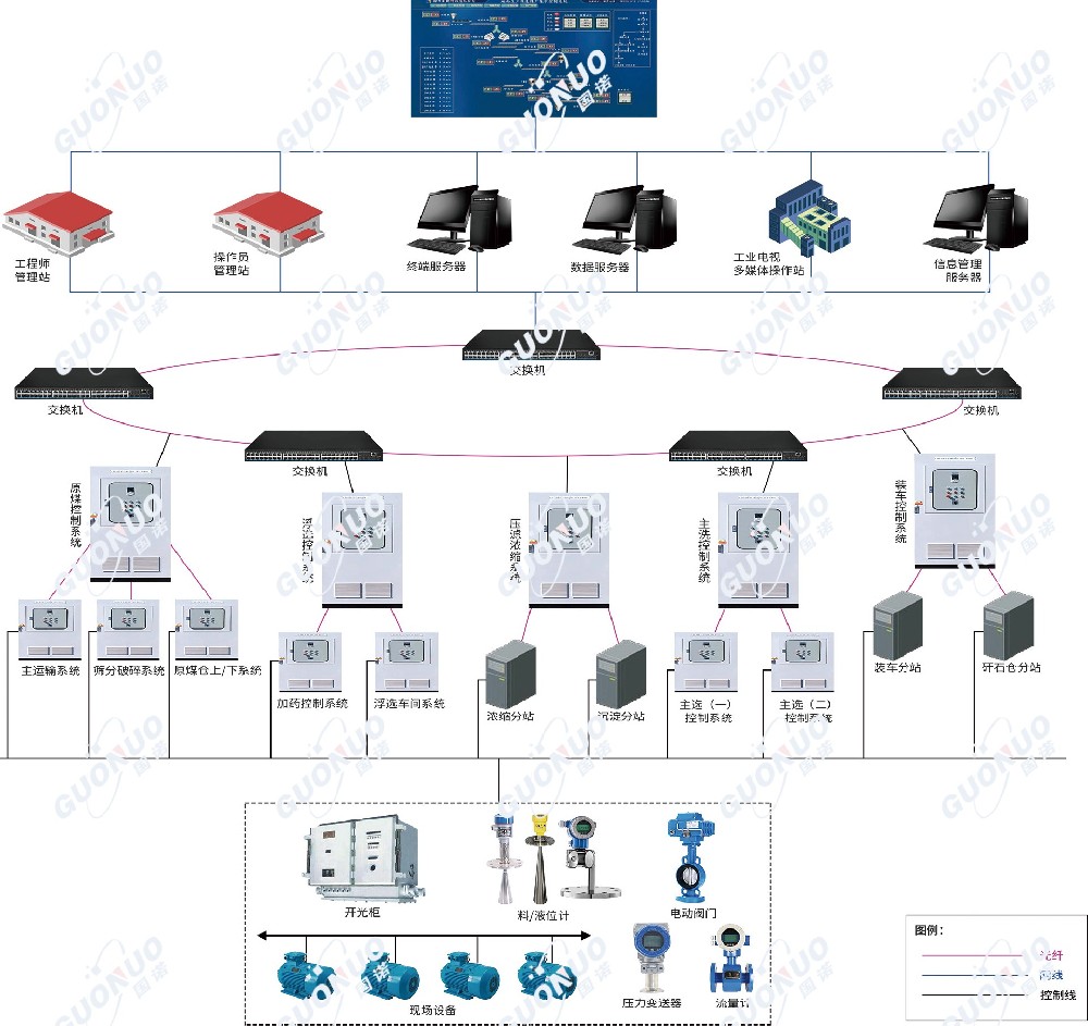 煤礦地面生產(chǎn)系統(tǒng)集中控制系統(tǒng)通常由以下幾個子系統(tǒng)組成:生產(chǎn)集中控制子系統(tǒng)?、重介密度子系統(tǒng)?、調(diào)度通信子系統(tǒng)?、煤礦圖像監(jiān)視系統(tǒng)?、計算機(jī)信息管理子系統(tǒng)?。負(fù)責(zé)全廠生產(chǎn)工藝設(shè)備控制、工藝數(shù)據(jù)監(jiān)測控制、設(shè)備工況監(jiān)測控制、信息管理、工業(yè)電視監(jiān)視及生產(chǎn)調(diào)度指揮。