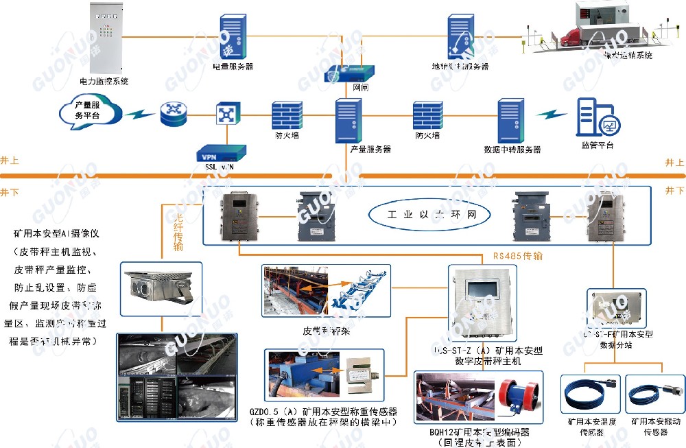 該系統(tǒng)主要由礦用隔爆兼本安型皮帶秤主機、礦用稱重傳感器、礦用速度傳感器、礦用本安型攝像機、礦用本安型數(shù)據(jù)分站、礦用本安溫度傳感器、礦用本安振動傳感器、礦用防爆交換機以及《煤礦產(chǎn)量遠(yuǎn)程監(jiān)控系統(tǒng)》軟件系統(tǒng)等組成。